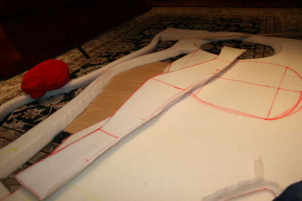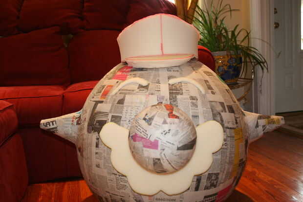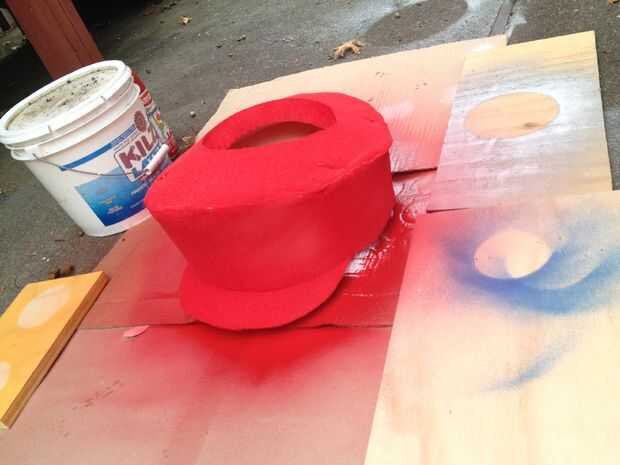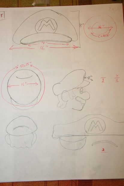 El sombrero es una forma muy difícil y era difícil averiguar cómo romper en pedazos pude recortar. Una vez más, hice más bocetos para aprender la mejor manera de hacerlo y utilizan un juguete de Mario tenía como referencia. Una vez que lo tengo lo suficientemente cerca, cortar las piezas individuales de la ropa de cama de espuma, caliente les pegan y cortar un agujero para la cabeza meterlo por la parte superior. Asegúrese de que el sombrero cubre el agujero que se asigna por sí mismo en el cuerpo de Boo. El símbolo en el sombrero es sólo un disco de Junta de cartel m corte fuera de él (también aerosol pintado blanco para darle un brillo).