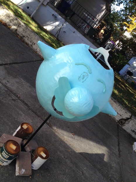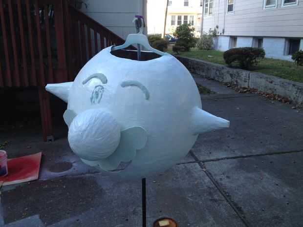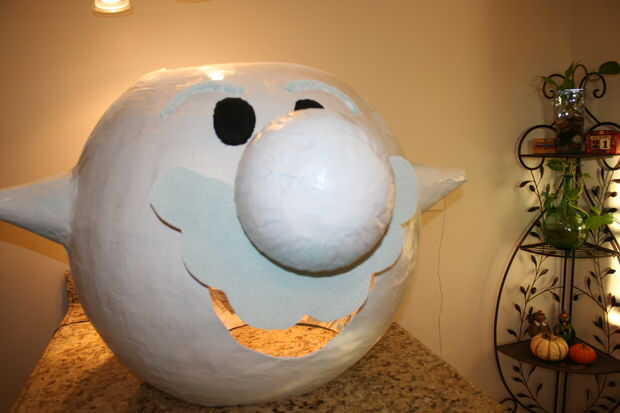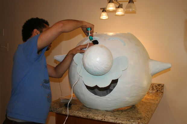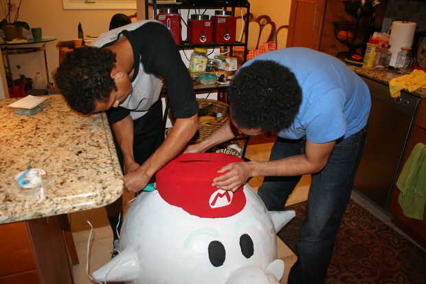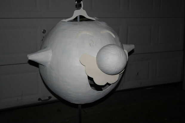 A continuación, aerosol pintado los ojos y pegado en el cuerpo, junto con el sombrero de Mario. Utilizando cartulina y la pieza del cuerpo cortado para hacer el agujero de la boca, remonta hacia fuera una forma podría arrugarse y unirlo todo en un boca 3-d que se ahueca, dando el traje más dimensión y profundidad. He rociado lo negro y pegado al interior para crear la boca. A continuación probé algunas maquetas de papel de la lengua para conseguir el tamaño correcto y forma, corte de espuma, del lecho y había pegado en el interior.