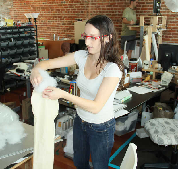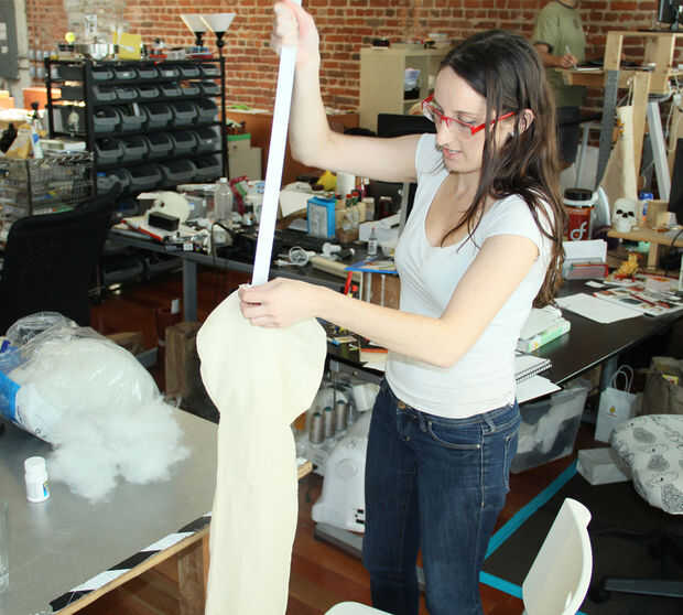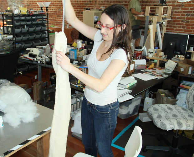 • Empuje el relleno hasta el otro extremo de la bufanda.  Ya que la bufanda es largo usé una vara de yarda a ayudar con esto.