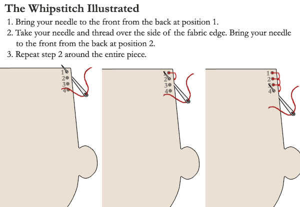 ¿No está seguro de cómo dar puntos de sutura? He incluido una ilustración para hacer whipstitches más abajo, o puedes leer más aquí. La puntada sí mismo no es demasiado importante, lo importante es mantener tus puntadas apretadas y juntas. Un Sobrecosa también algunos de la frontera blanca debajo de la costura, doble manteniendo cosas limpio en el exterior.