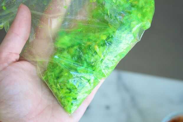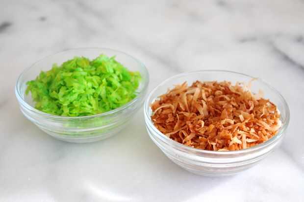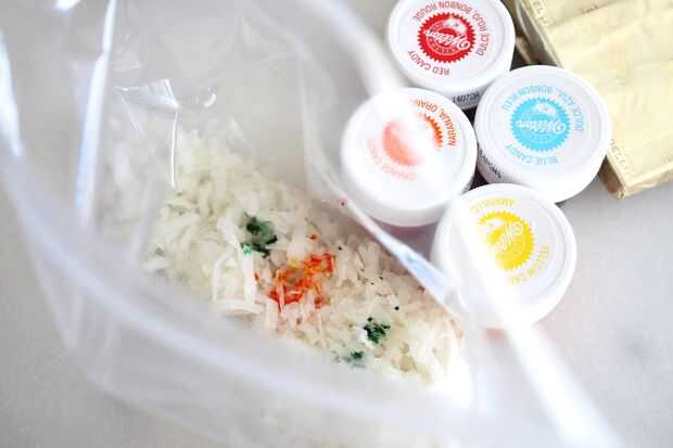 Para teñir el resto del coco, añadir un poco de la llanura seca coco en una bolsa de plástico junto con un colorante líquido. He usado cantidades iguales de amarillo y verde hasta que fue agradable y brillante.
