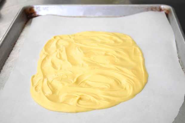 Extiende el color chocolate blanco hacia fuera sobre un pedazo de papel sulfurizado sobre una bandeja para hornear. El mío es entre 1/8 y 1/4 pulgada de espesor.