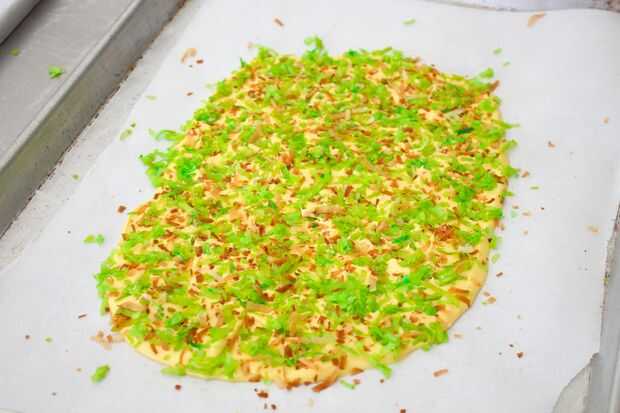 Espolvorear el coco tostado y verde en la parte superior y presione suavemente hacia abajo.