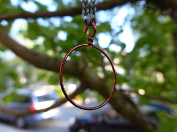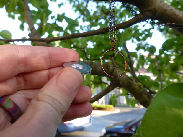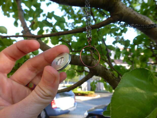 5. tomar un alambre y envolver la mitad del mismo alrededor de la pendiente, como se ve en las fotos. Doblar los extremos del cable (pero no demasiado bruscamente) cuando se encuentran, habiendo alcanzado el círculo completo. Girar juntos una vez o dos y luego el resto del alambre alrededor de un objeto pequeño, circular para crear un agujero de la cadena ir a través del viento. El colgante debe poder hacer estallar dentro y fuera del cable. Oso con él, este paso puede ser un poco frustrante. Tuve que tirar un cable o dos antes de que finalmente me dieron razón. A trabajar eventualmente.