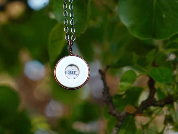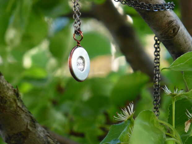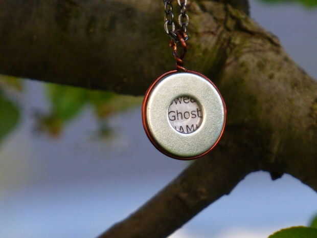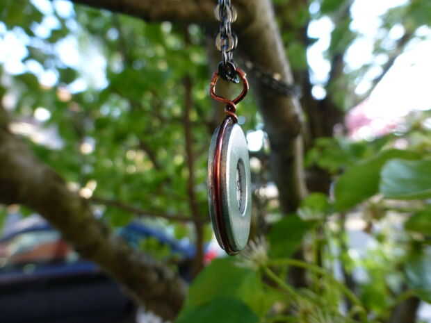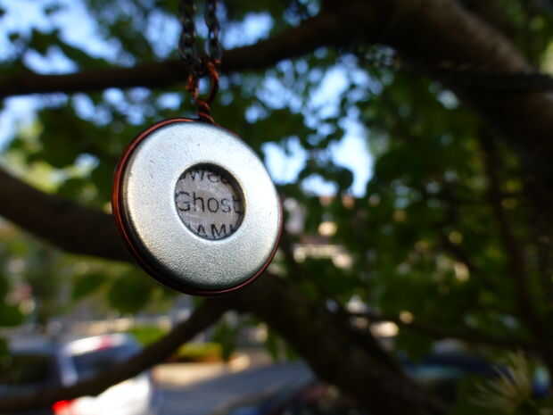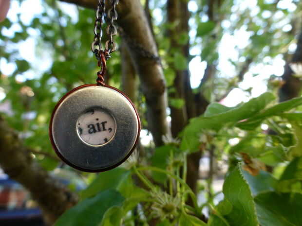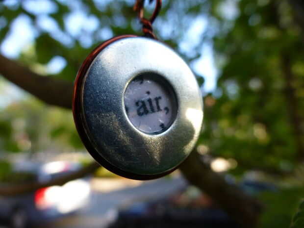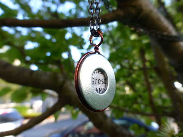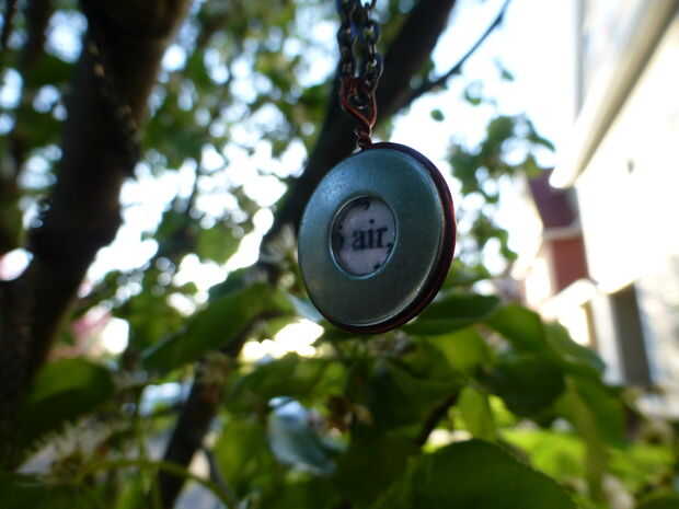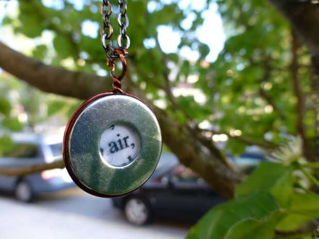 Este bonito colgante pequeño es bastante fácil de hacer y utiliza el texto de un libro real. La parte de la arandela del colgante puede extraerse el alambre, que hace fácil mover de un tirón el colgante alrededor. El colgante en las fotos tiene texto que fue cortado de los scripts que utilicé cuando estuve en Hamlet y La tempestad.
