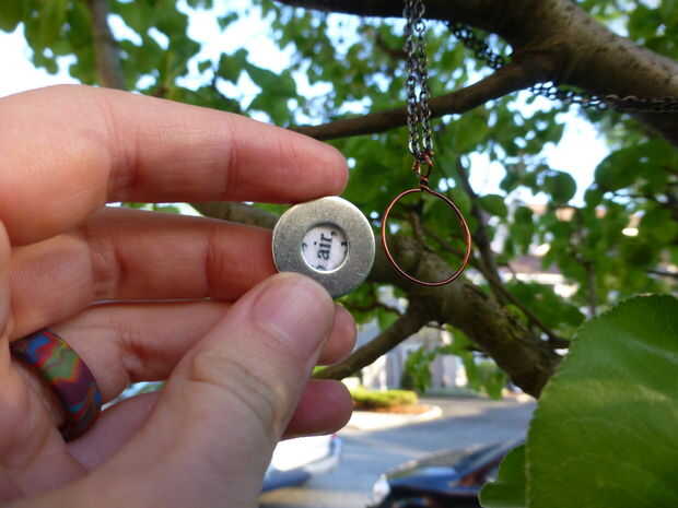 3. pegar las dos arandelas junto con las piezas de cinta de doble cara que se utilizaron para fijar el texto. Asegúrese de que el colgante se ve sin embargo quieres que se vea y luego rodean los bordes de las arandelas con pegamento para mantenerlos juntos