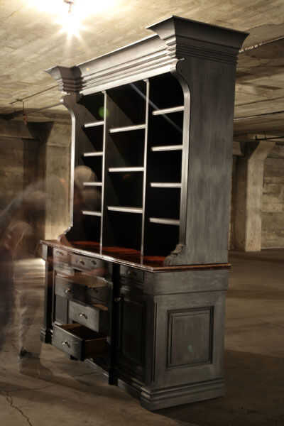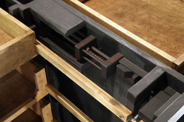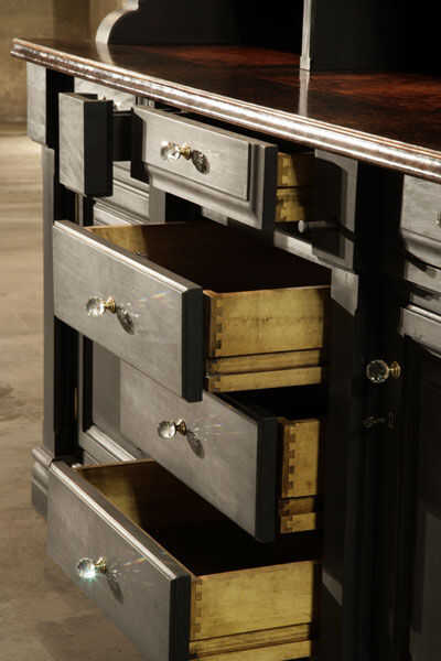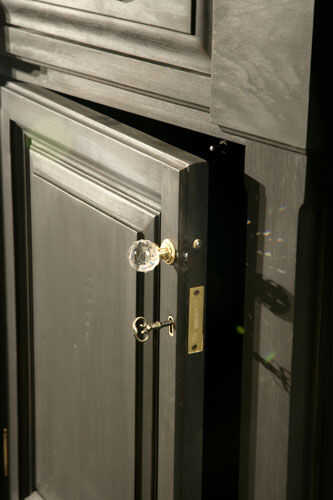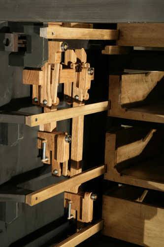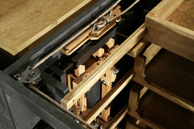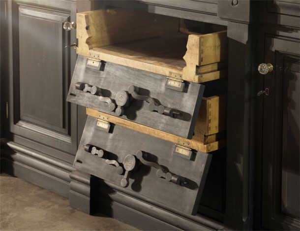 No es sólo lo que es visible que hace esta pieza única, sino más bien lo que pasa invisible. En la librería es un escondido cajón. Para acceder al cajón, tienes que tirar de cada uno de los cajones accesibles de abrir a cierto punto antes de los cierres de control de diapositiva fuera del camino, similar a cómo las clavijas en una cerradura normal. Que permite una longitud de espiga de madera se deslice hacia fuera – escondido como un nudo en la madera sí mismo, para desencadenar la apertura del compartimiento secreto construido en lo que parece una moldura normal.