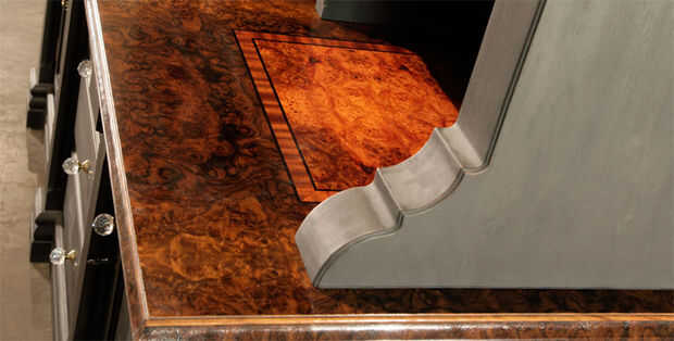 Para crear los tonos en el nogal y los Cárpatos Olmo burl libro emparejado tapa de la chapa que usé laca de botón Kusmi #1 importado directamente de India. La laca se aplica sobre una capa preliminar de aceite hervido de linaza. El aceite penetra la madera dando una iluminación máxima a las fibras. Porque no hay ninguna pureza estándar para el etanol con la etiqueta "Alcohol desnaturalizado" para disolver la goma laca, usar alta, 190 prueba Everclear (95% etanol puro) como mi solvente goma laca preferida. No hay otro final puede comparar cuando se trata de la iluminación de la belleza natural inherente a la madera.