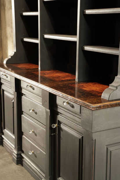 La apariencia de la superficie de la estantería pintada replica en muebles antiguos. Como mayores acabados tradicionales, la pintura de leche usada en esta librería consta de proteína de leche, arcilla, pigmentos de tierra y cal. Donde puede saltar la pintura convencional y arañazos, pintura de leche penetra en el grano; pulido como se usa. Para esta pieza utilicé tres capas de color: verde de lexington, granero rojo y negro de la echada en ese orden. Las complejidades sutiles mejorará como los muebles, creando un aspecto de Carey. Además, he añadido pequeñas salidas de lágrima y otras "marcas de herramienta de mano" para crear la apariencia auténtica de un mueble antiguo genuino, junto con diapositivas del cajón de madera personalizado y completo embutir latón sólido.