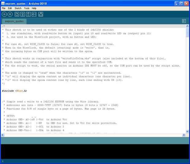 A continuación, cargar eeprom_quotes.pde bosquejo, compilarlo y subirlo. En este punto Wiseduino está esperando recibir caracteres en el puerto serie. Para enviar los caracteres, ejecute (haga doble clic en) WriteFileToCom.vbs. Este es un script VB que lee el contenido del archivo quotes.txt (incluido en el zip) y lo envía sobre el puerto serie. Asegúrese de que la línea refiriéndose a quortes.txt especifica la ruta correcta de absolut. A una velocidad en baudios de 9600, tarda unos 10 minutos para transferir el archivo entero (y escribir en EEPROM).