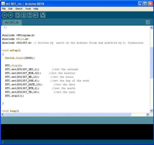 Ds1307_test.pde de carga y en setup(), modificar las líneas que envían el comando "ajustar hora".