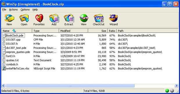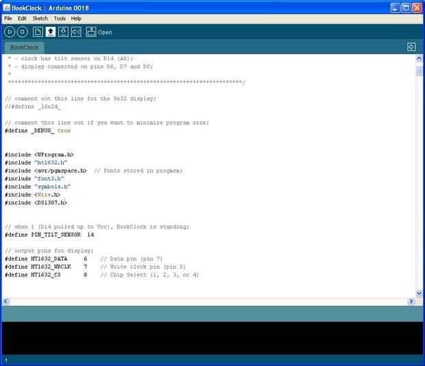 Coloque los BookClock.pde, compilación y carga. Este bosquejo contiene el código que lee el EEPROM y el RTC y muestra las citas y la hora.