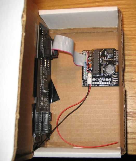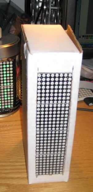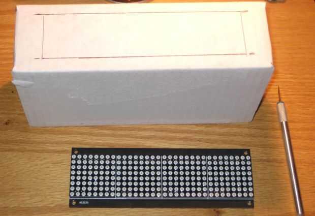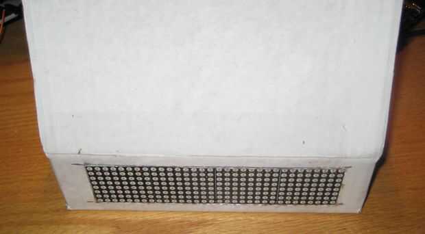 Cartón es fácil de cortar con un cuchillo xacto. Trazar el contorno de la pantalla de LED (foto 1), luego corte a lo largo de las líneas (foto 2). La abertura debe quedar la pantalla tanto como sea posible (foto 3 y 4). Utilizar alguna cinta (yo usé cinta aislante) para pegarlo en el interior de la caja (foto 5).