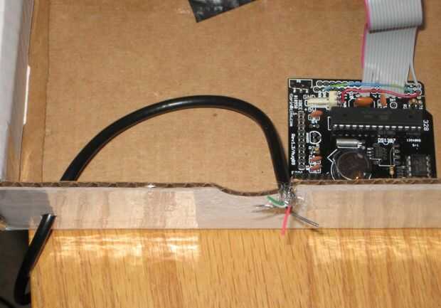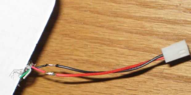 Separado el interior los cables para que los rojos y negros son accesibles, entonces cada uno a los correspondientes cables rojos y negros del cable de alimentación que viene con Wiseduino (foto 2) de la soldadura. Aislar las conexiones soldadas con cinta aislante.