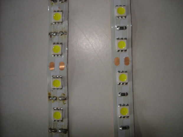 En las tiras de LED, 3 LEDs y una resistencia se conectan en serie, este grupo es conneced en paralelo con otros grupos similares a tira de forma.