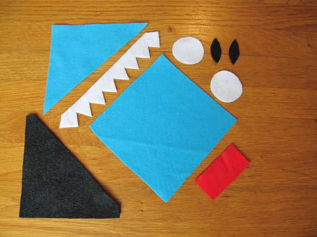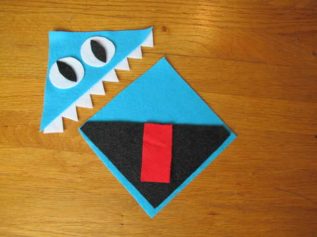 Para hacer un bookmonster necesita recortar dos ojos y pupilas, unos dientes de miedo, una lengua y dos coloridas piezas de fieltro para la cabeza. Podría usar mi plantilla o simplemente recortar un cuadrado del tamaño que desee y pasar de allí (como se puede ver en la última foto).