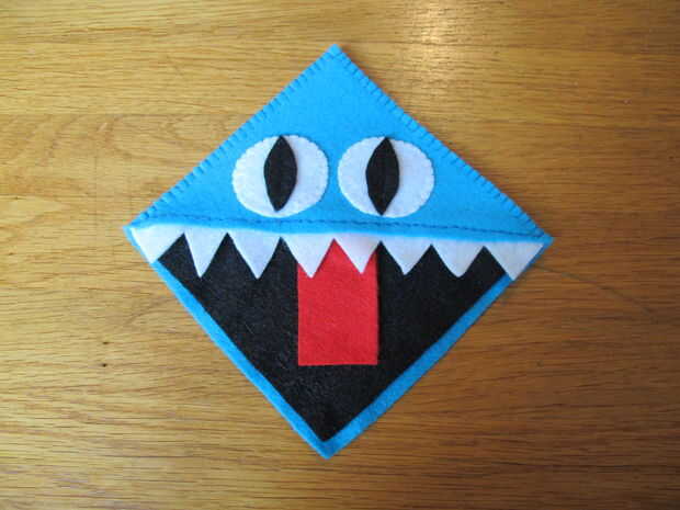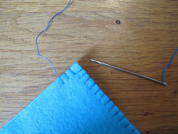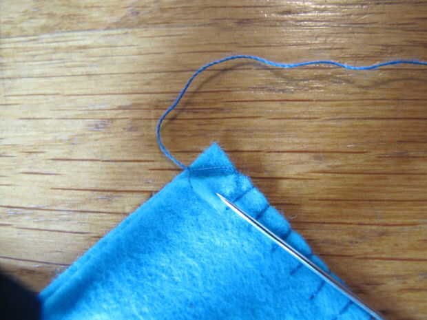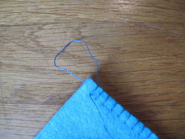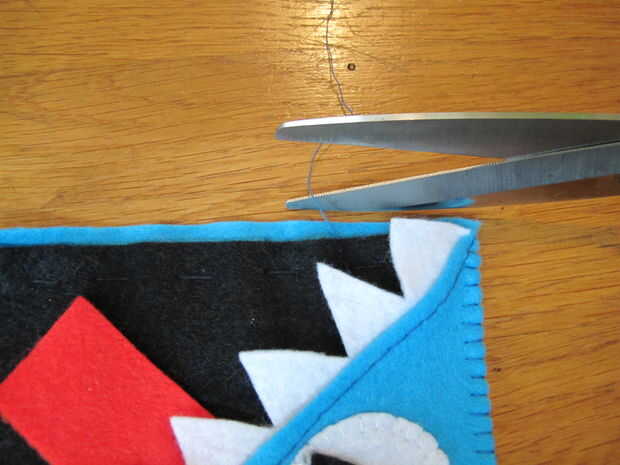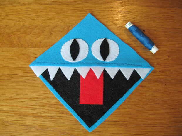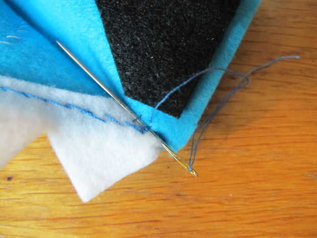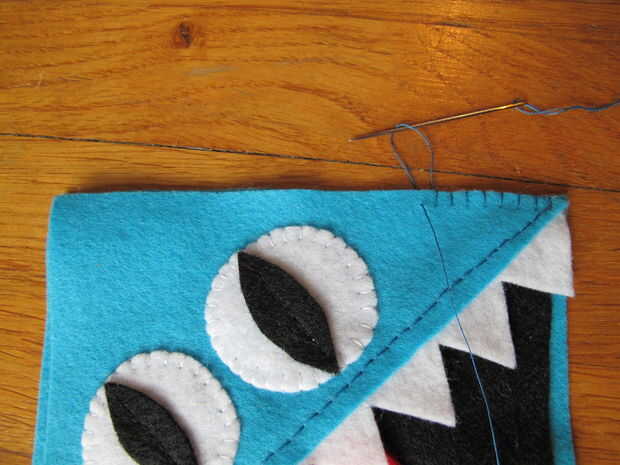 Para la costura alrededor de la esquina podría intentar replicar imágenes de tres a cinco. Escondí el hilo que normalmente va en la parte superior el tejido entre las dos piezas de fieltro. De esta manera la costura se verá igual en el frente y la parte posterior de tu monstruo.