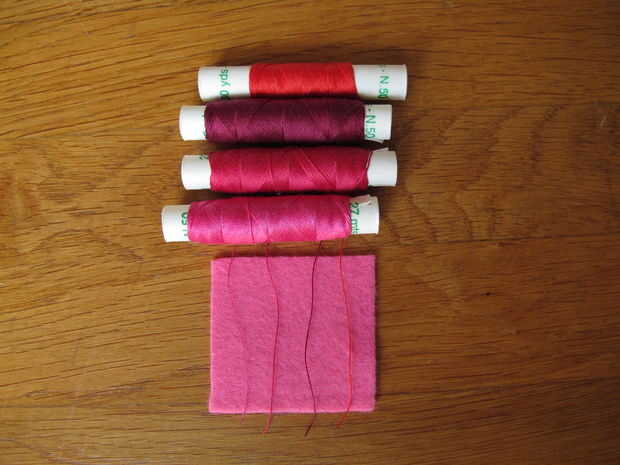 Usé un rosado más oscuro del hilo de rosca (segundo desde la parte inferior y desde la izquierda, en el cuadro 4) así que estaría parado hacia fuera muy bien contra el fieltro. Pero con su color de fieltro un hilo rojo podría apenas ser más guapa, sólo echa un vistazo y ver lo que sería bueno.