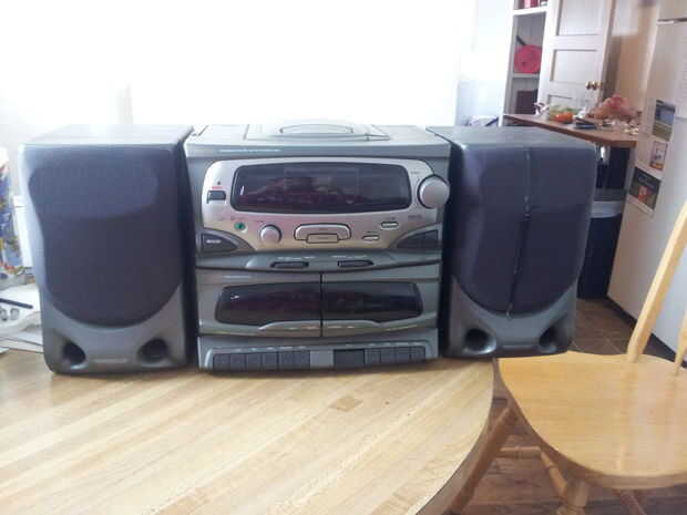 Vamos a modificar una vieja caja de auge (AM/FM/CD/Tape) añadir un aux en cable por lo que podemos conectar un iPod o un teléfono a él. Estoy utilizando una caja de auge Koss HG835 que encontré en una tienda por $15. Cuando hemos terminado, podrá jugar desde el aux en la radio, CD y cable.