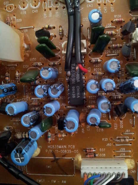 Aquí la parte difícil es averiguar de dónde conectar el cable a la placa de circuito. Estamos planeando sobre el reemplazo de la función de la cinta del estéreo con el cable aux. La señal del reproductor de cintas se alimenta a través de un pre-amp para fortalecer la señal antes de que salga en el amplificador regular. Nos vamos a conectar nuestro cable aux en el circuito entre el preamplificador y el amplificador. La forma más sencilla de hacerlo es soldar el cable aux a la salida pre-amp. En nuestra junta, el preamplificador es un chip negro etiquetado Toshiba TA8189N. He encontrado el datasheet para el chip en línea por googlear TA8189N.