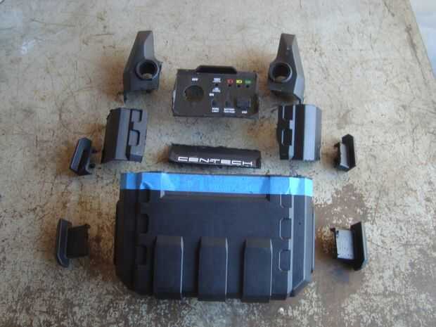 Las mitades de la parte inferior de la caja se convirtió en la caja de batería. Los puertos de alimentación de 12VDC cuidadosamente fueron suprimidos y una placa frontal fabricado de chapa de 20g. Un poco de epoxy de 5 minutos consigue el trabajo hecho. El panel de control fue recortado también cuidadosamente hacia fuera. sí, se quedó la luz de trabajo. De hecho, te diré una agradable sorpresa sobre él más adelante...