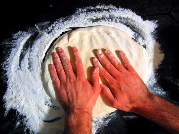 En primer lugar, vas a poner la masa sobre una superficie limpia, espolvorear harina sobre él y aplanar. No desea utilizar las puntas de los dedos, pero más bien los frentes de las manos. Y quiere empujar hacia abajo y hacia fuera al mismo tiempo, para que usted obtenga un espesor unform mientras que estiran hacia fuera. Desea que esta masa sea bastante fina.