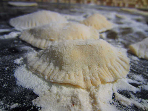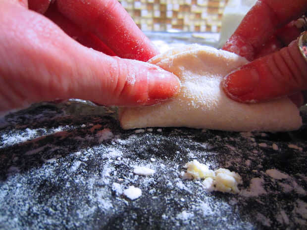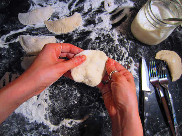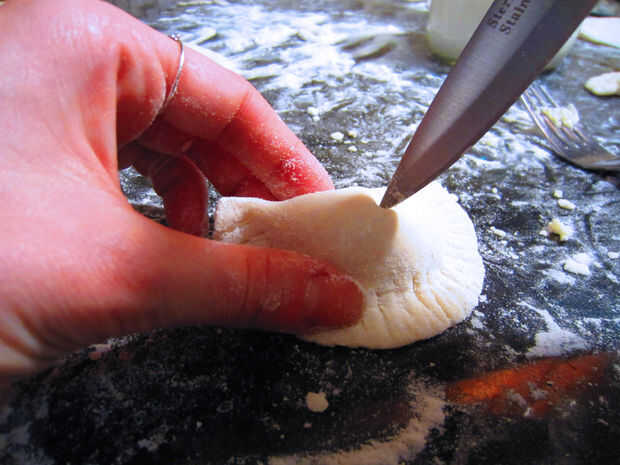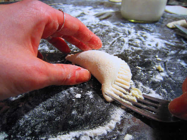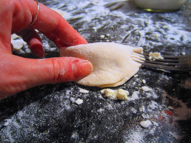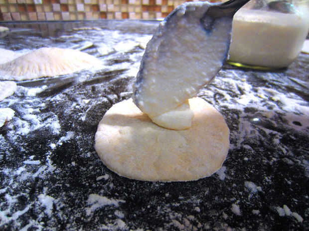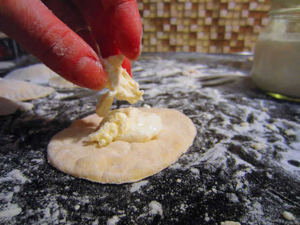 Tomar individualmente cada círculo, estirar levemente y puso sus rellenos (ricotta y mozzarella) en el centro muerto, mozzarella en la parte superior! Desea empujar hacia abajo los rellenos mientras que usted Levante el extremo posterior hacia el frente, por lo que se está estirando la masa hasta el límite en el centro como traerlo hasta frente a sellar. Presione firmemente el dedo pulgar en el centro y trabajar la masa en ambos lados hasta que está completamente sellado. Puede utilizar un tenedor para que los bordes se vean bastante y para mayor seguridad después. Asegúrese de crear un orificio en el centro para liberar la presión mientras que cuece al horno!