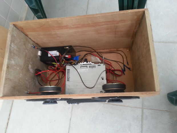 he estado mirando en instrutables y también vídeos de YouTube y foros. Esto es de dónde proceden mis ideas. para hacer este boombox poco utilicé una botella de vino caja de madera que cortar a un tamaño más pequeño, una batería de 12v 12ah, un amplif