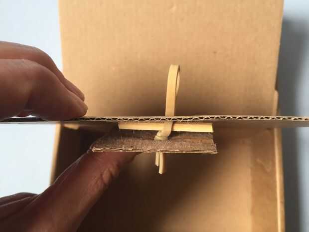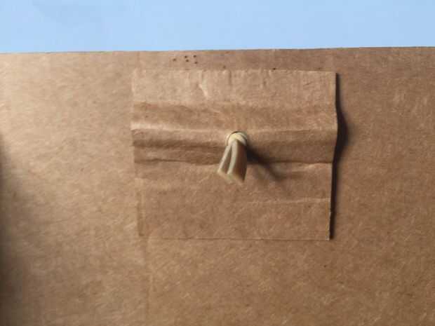 Empuje un elástico anudado a través del orificio de la puerta y sandwich un fósforo y un trozo de cartón en el otro lado con la cola del nudo saltando la parte de atrás. Asegúrese de que la tarjeta está orientada con sus crestas paralelas con el borde lateral de la aleta, pliegue a tapa nudo y pegamento firmemente en su lugar.
