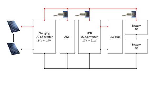 Decidí obtener 6V dos selladas las baterías porque suman a 12V, son fáciles de cargar, barato y robusto. Tienen 4, 5Ah cada, cual nos deja con una potencia estimada de 12V * 4, 5Ah = 54Wh. Debería ser suficiente para cargar mis dispositivos y escuchar música durante un buen rato! Tiempo a plena luz del sol de carga trata de 54Wh /(2*5W) = 5, 4 h. Si contamos en todas las pérdidas y la mentira en las hojas de datos, las baterías podrían ser completas después de un largo día de sol brillante.