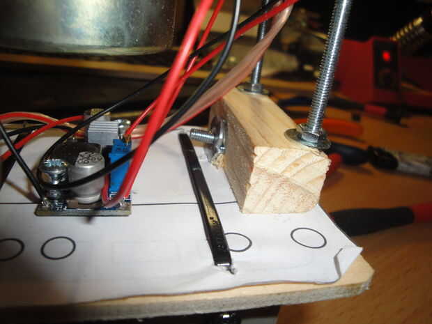Ahora cortar dos trocitos de madera y taladrar dos orificios que coinciden el espacio entre dos varillas roscadas. Estas dos piezas arreglarán la electrónica interior dentro de la caja, para que no caiga hacia fuera. Mide la distancia desde el extremo inferior de las varillas roscadas a la mitad de las piezas de madera y lo colocó todo dentro de la caja de munición.