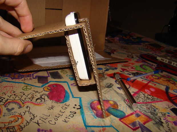 Luego, doblar la sección en forma de reproductor de mp3 hacia atrás como usted doblar la sección principal de la cartulina, haciendo un hueco para su reproductor en.