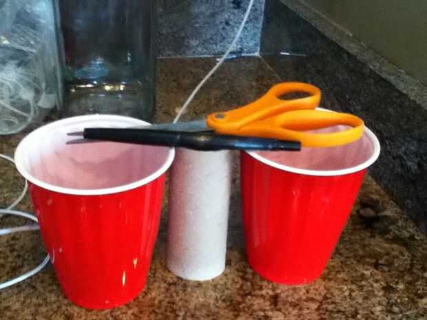 Necesita un marcador, 2 tazas solas, el cartón interior del rollo de papel higiénico, tijeras y un iphone o itouch.