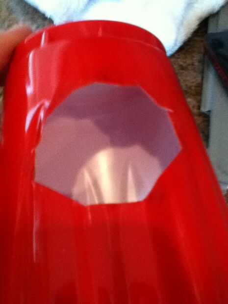 Necesita cortar un agujero del tamaño del extremo del rollo en ambas tazas. Luego necesitas hacer un corte el ancho y largo como la i dispositivo.
