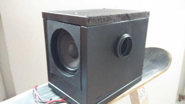 Último pero no menos importante hice un agujero en el lado de la caja para el bass reflex tubo (que es un tubo de PVC normal en mi caso: D) y pintado con alguna pintura en aerosol negro.