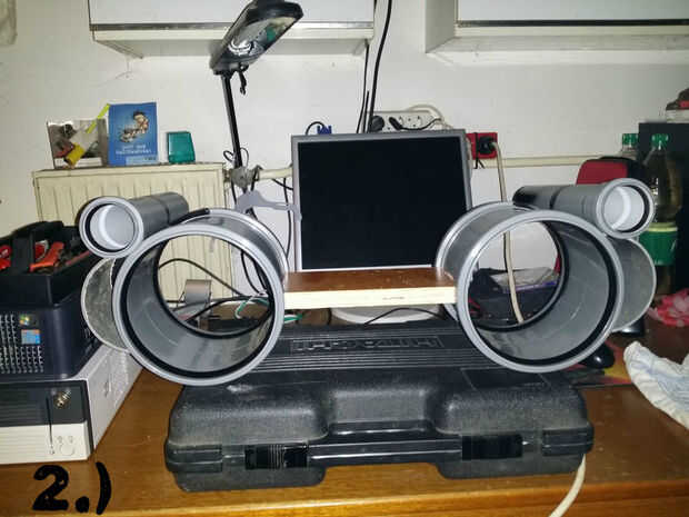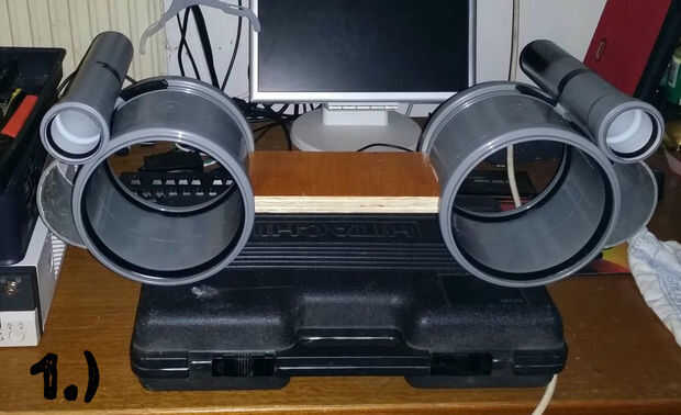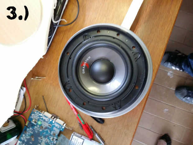 3-4.) atornillar la madera soporte para amplificador con tres tornillos en cada lado. Cuando esté seguro de que todas las piezas de madera para los altavoces se ajustan bien puede atornillar los altavoces. Que pegué a la caja del altavoz de agudos en la caja de altavoces de 2 vías. I utiliza las piezas de basura de la pipa del PVC, cortarlas por la mitad y hacer una decoración en ambos lados.