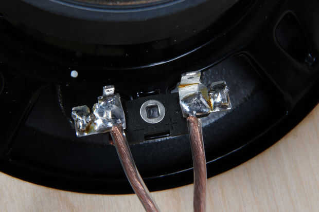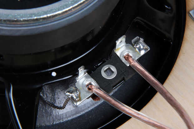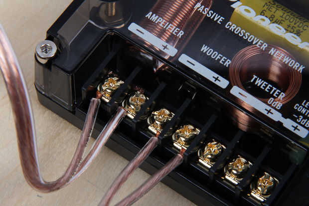 Dos piezas de 2-3' de cable de altavoz de la tira y la soldadura de los extremos de un cable en cada uno de los terminales de altavoz de subgraves.  Conecte el otro extremo a lo tornillos terminales etiquetados "subwoofer" en cruce correspondiente de ese canal.  Asegúrese de que conecte el cruce salida a + la + terminal de altavoz.