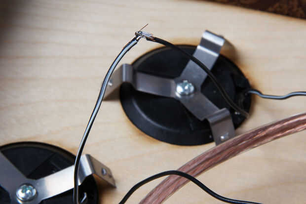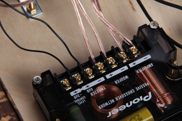 Desde los dos altavoces de agudos tienen una resistencia de 4 ohmios, alambré les en serie a la salida de tweeter del crossover.  Para hacer esto, conectar un tweeter + conducen a la + crossover terminal (puede que necesite alargar el cable).  Luego conecte el - cable del tweeter segundo (del mismo canal) a la - cruce terminal.  Conecte los dos cables restantes de los tweeters mutuamente para conectar en serie.  Repetir este proceso para el segundo canal.