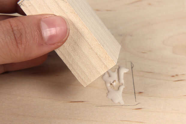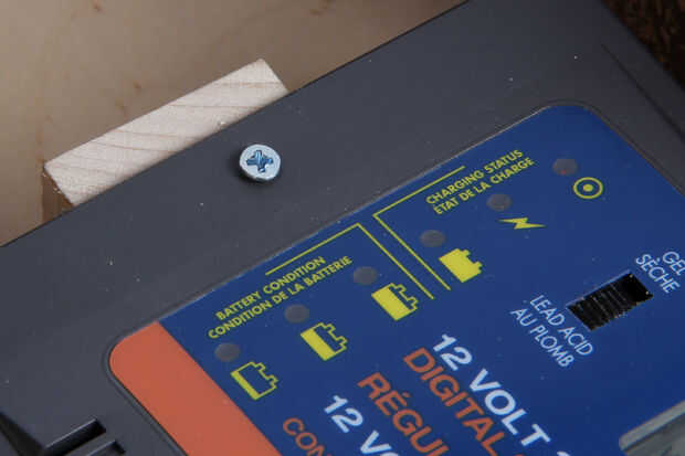 Ahora que se han realizado todas las conexiones para el controlador de carga, use pegamento para madera y un tornillo para montar dos piezas de 2" bloque de madera para el panel de madera contrachapada.  Una vez seco el pegamento para madera, utilice tornillos para fijar el controlador de carga al frente de estos bloques.