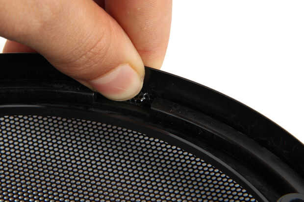 Presione las lengüetas en el interior borde de cada uno de lo subwoofer cubre para quitar el panel frontal de malla de la protección de borde.