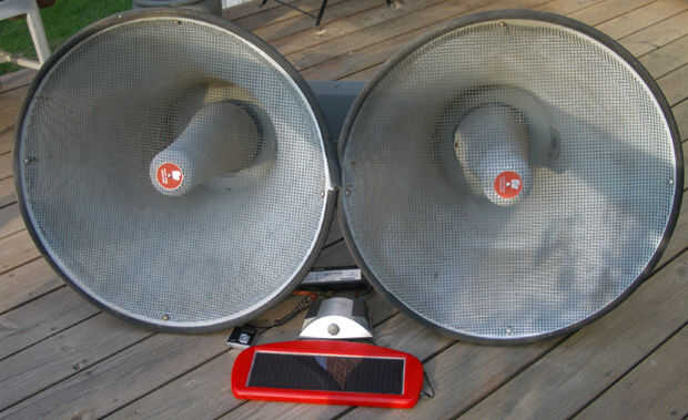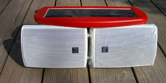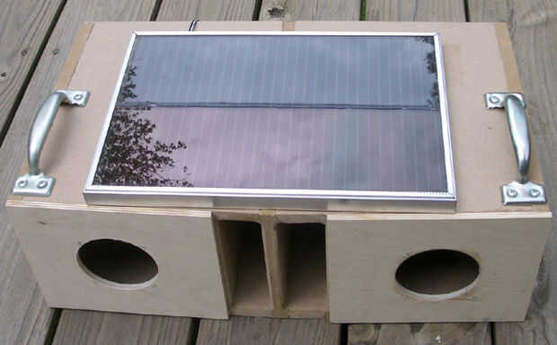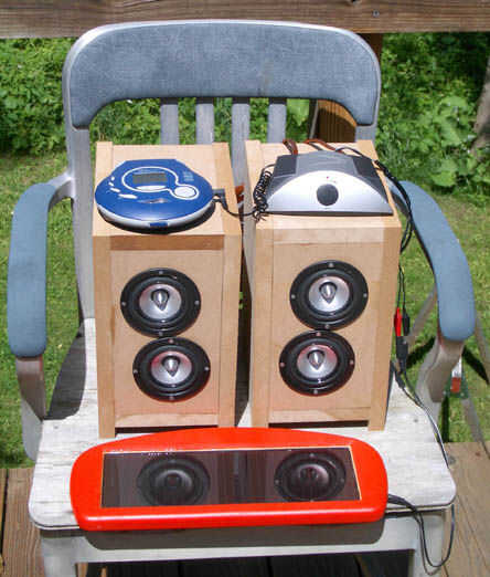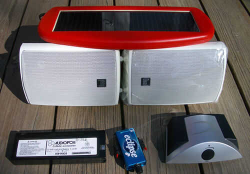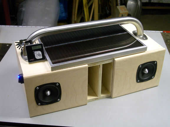 Combinan un pequeño amplificador digital eficiente de la energía, altavoces de estantería baratos, baterías, un pequeño panel solar y su reproductor de MP3 como una fuente.