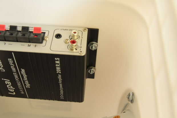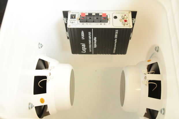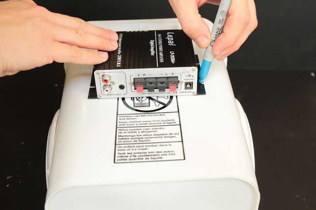 Luego es tu amplificador! Coloque el amplificador en el exterior para marcar donde deben ir las tuercas de la máquina. Quitar, luego montar los altavoces en una tercera pared del cubo.