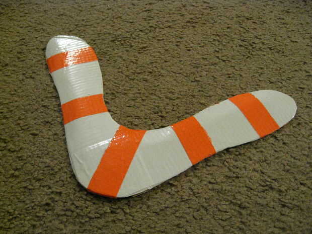 he estado intentando hacer un boomerang muy buena para un rato ahora. He hecho boomerangs madera exitosas, pero siempre rompen después de unos buenos golpes duros sobre el pavimento. Así que decidí que haría un boomerang más resistente. Fuerza de este boomerang cinta de conducto radica en el hecho de que puede doblar sin lastimarla (la curva todo, pero no descanso lo.) y el hecho de que es resistente al agua. Este boomerang si da correctamente y si se hace correctamente volverá a usted (a menos que sea demasiado viento), aunque esto puede tomar algo de práctica.