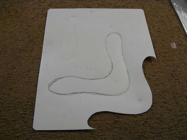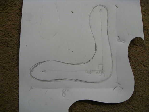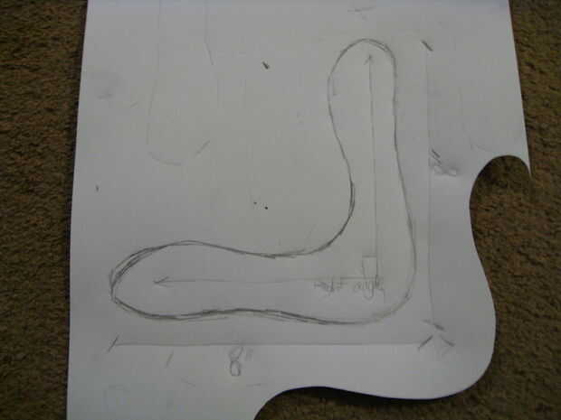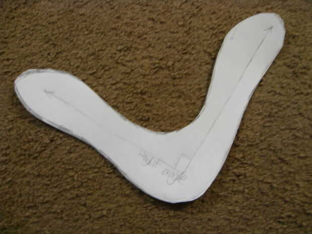 Ahora necesitas dibujar el contorno de su boomerang. He encontrado que los boomerangs con forma de L funcionan mejor. Yo no haría un boomerang más grande que el en las siguientes imágenes. El ángulo no es demasiado importante. Yo diría 50-110 grados para el ángulo es bueno. También usted no quiere hacer las alas para adelgazar. No tengo un escáner, así que no puedo poner ninguna de mis contornos hasta en instructables. Si haces un esquema de trabajo por favor lo publique así que puedo poner en el instructable.