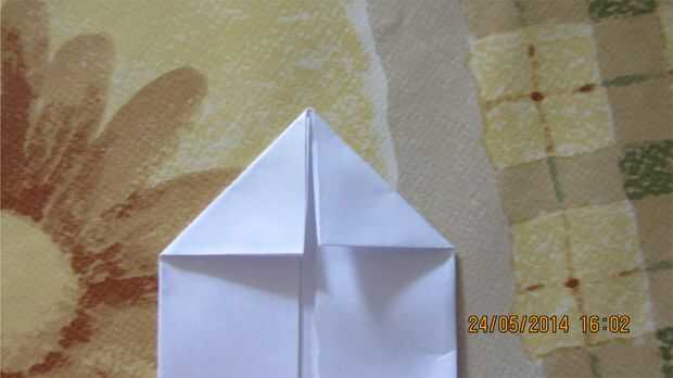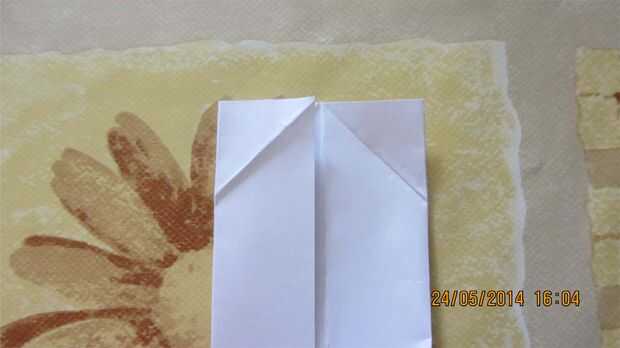 Levante un poco el papel abierto. Dobla ambas esquinas hacia el centro. Pliegues bien y despliegue.