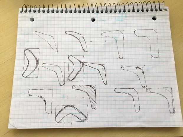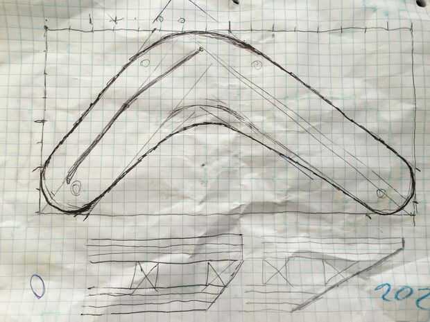Quería un enorme, robusto, útil escritorio; pero también una pieza de mobiliario que parecía podía volar. Tenía 4 pies de monitores y todas las cosas que me gusta que tenga a mano la ayuda. Había reflexionado y había bosquejado para más de un año y aprendió algunas cosas. Curvatura continua, radios grandes y recorte de las alas son esenciales para la elegancia de este estilo. (Demasiados Boomerangs tienen grandes vientres feos). Un diseño asimétrico fue atractivo y también encajar bien mi espacio. Biselado en los bordes podrían ser una ilusión de delgadez imposible. Y entonces un día me golpeó: yo podría chirriar exactamente la superficie que quería de una hoja continua de madera contrachapada. Alivia de la angustia de carpintería superficie hermética, corrió derecho a Lowe para dos hojas de media pulgada Blondewood.