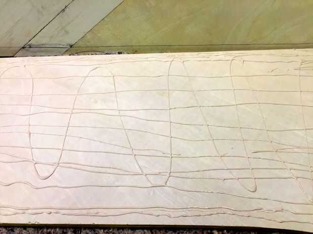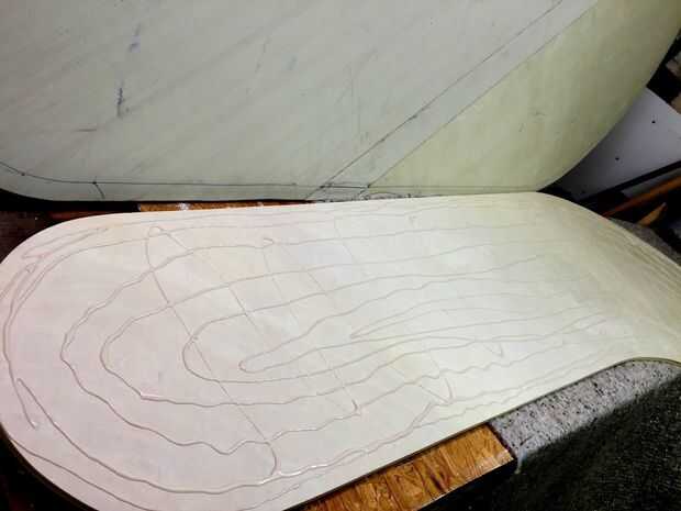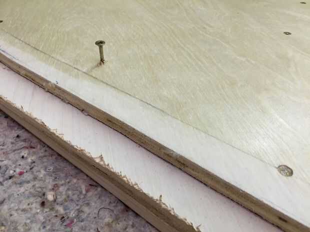 Welp, esa botella de pegamento desapareció rápidamente. Había pegado de las piezas de la capa media en la capa inferior y celebré junto con 40 + ¾ tornillos. Cuando sólido, que pegué encima de la capa superior, todo boca abajo y reemplazar los tornillos de ¾ con una variedad de 1¼ pulgadas. Esto me dejó con un paso de todo el borde, que esperaba aliviar en parte el esfuerzo necesario para cortar el biselado debajo.