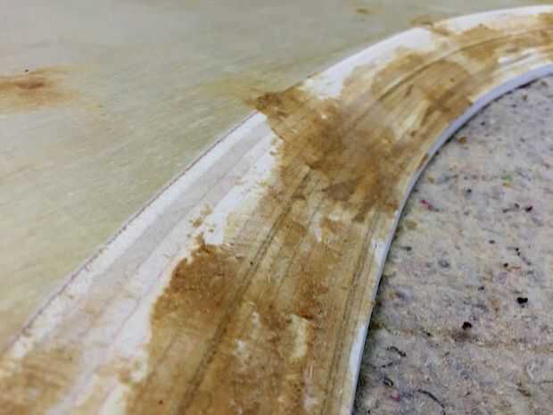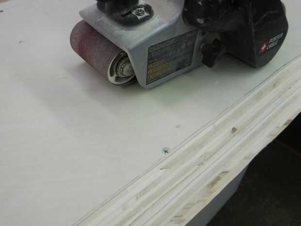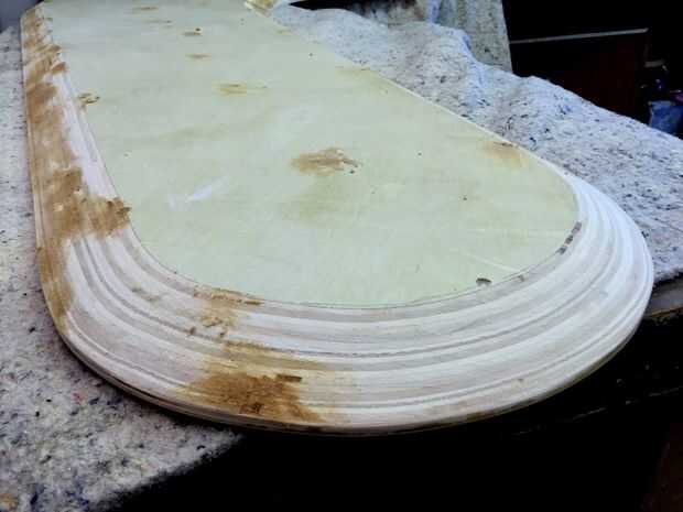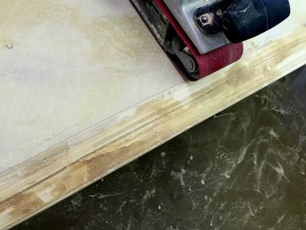 Consideré hacer una plantilla para la planificación o enrutamiento el bisel, pero el problema de bamboleo y puente alrededor del interior radio era abrumadora. Además, esta superficie muestra apenas. Tan con grano 36 brutal, puso tapones para los oídos, gafas y mascarillas para el polvo para esculpir las superficies del borde con una lijadora de banda. Era una tarde infernal. Hice galones de aserrín. La limpieza era real. Pero yo era capaz de utilizar unos pellizcos con pegamento para llenar los huecos en las capas.