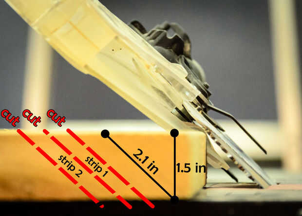 Si usas un 2xsomething, poner la Sierra de mesa en un ángulo de 45 grados (aumenta el ancho de banda de 1.5 pulgadas a 2,1 pulgadas). Como alternativa, podría girar los madera 90 grados y cortar tiras muy amplia (3.5" de 2 x 4, por ejemplo) y cortar las tiras hasta el tamaño que desee.