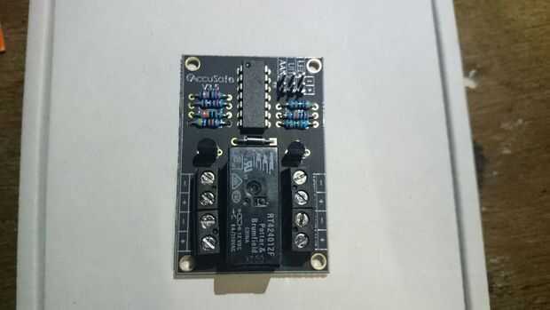 Entonces nosotros, o mi amigo realmente, montado el AccuSafe [3]. Él nunca había soldado a una placa de circuito impreso (PCB) antes, pero resultó grande. El AccuSafe es un PCB con un circuito comparador y un relé a bordo que corta la corriente el la electrónica en 11.5v para evitar dañar la batería. También conmuta a la fuente de alimentación/cargador si está disponible.